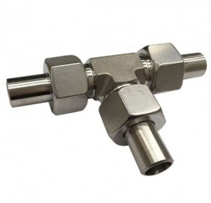 LIGHT METRIC (24 DEGREE CONE SEAT) MALE TEE FITTING CONNECTED WITH LIGHT METRIC (24 DEGREE CONE SEAT) FEMALE SWIVEL X WELDING FITTING WITH RING NUT